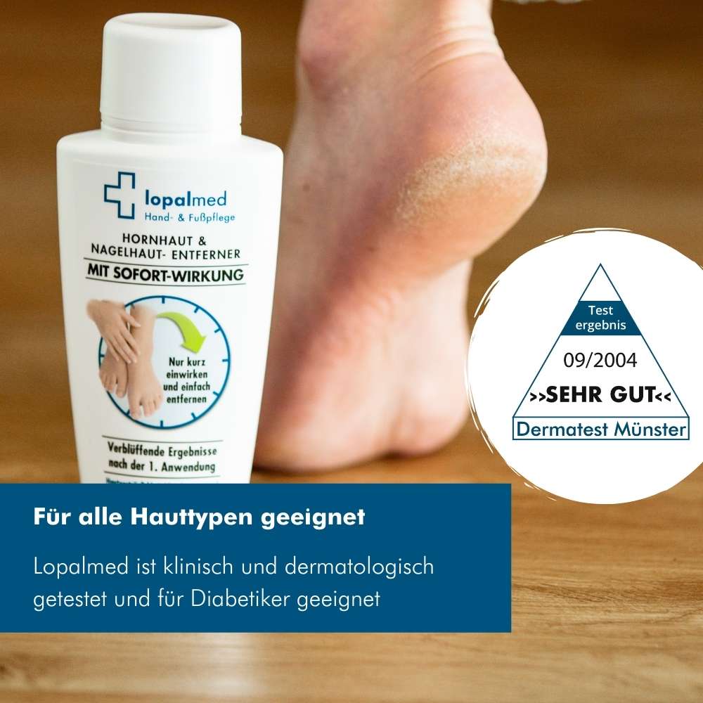 Mit der Lopalmed Hornhaut & Nagelhaut-Entfernungslotion haben Sie die Möglichkeit, Hornhaut und Nagelhaut ohne Bimsstein, Raspel, Hornhauthobel oder Nagelhautschere schonend und völlig verletzungsfrei zu entfernen.