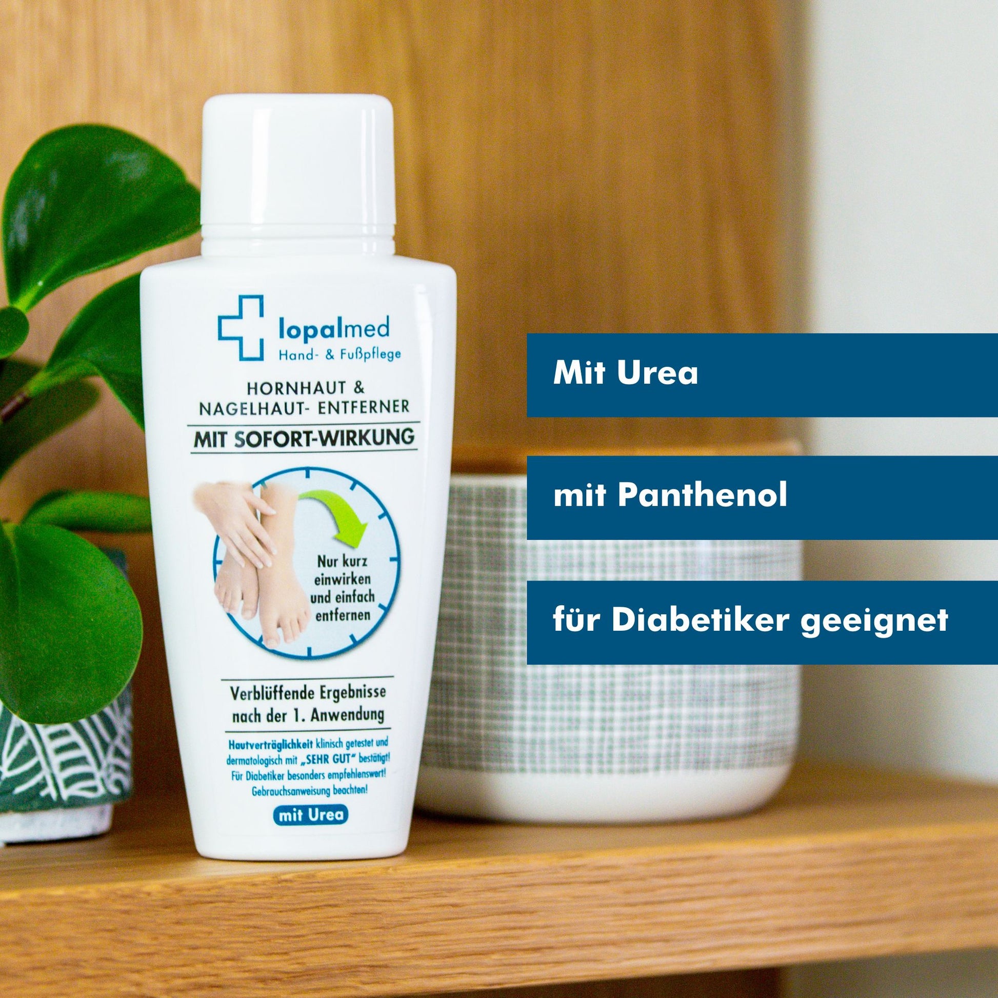 Mit der Lopalmed Hornhaut & Nagelhaut-Entfernungslotion haben Sie die Möglichkeit, Hornhaut und Nagelhaut ohne Bimsstein, Raspel, Hornhauthobel oder Nagelhautschere schonend und völlig verletzungsfrei zu entfernen.