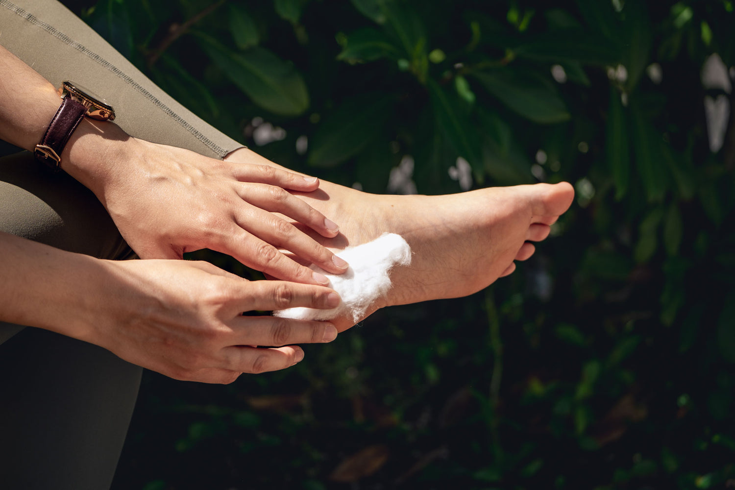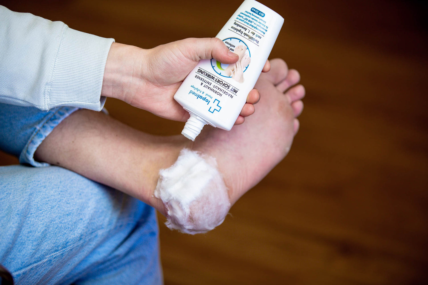 Gib eine dünne Schicht Naturwatte auf die betroffenen Stellen und achte dabei, dass der Fuß noch nicht eingecremt oder nass ist!